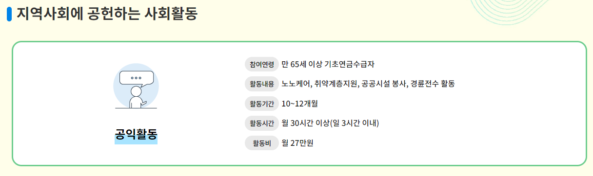 - 참여연령: 공익활동은 만 65세 이상의 기초연금 수급자를 대상으로 합니다.